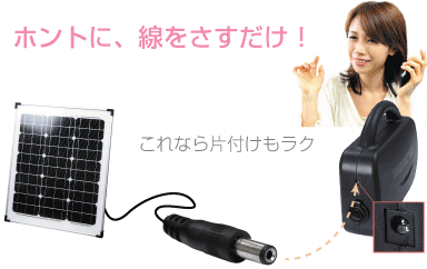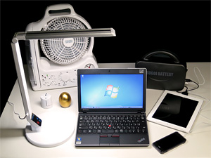 デスクで 太陽光で作ったマイ電気は、デスクで大活躍。 電気代を気にせず、CO2排出を気にせず、思う存分使い倒せます。 ・ iPhone/iPad ・・・付属の充電アダプターor製品付属ケーブルで。 ・ノートパソコン・・・別売パソコン電源アダプターまたは別売インバーターで。 ・ライト、扇風機など・・・12V対応機器の多くが付属の12Vケーブルで可能。 ・USB機器・・・製品付属のUSBケーブルでOK。