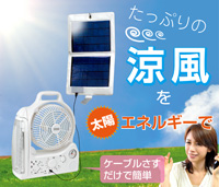 たっぷりの涼風を太陽エネルギーで コンパクトでECOな自家発電システム 太陽 夜間に、日中に 災害時に、使う! ケーブルさすだけで簡単に使用できます 携帯電話、スマホ iPhone、iPad を充電可能 防災も、これ1台で